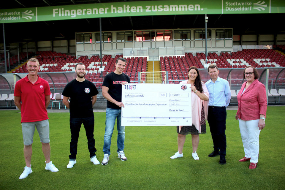 Fortuna-Fans überreichen dem Düsseldorfer Bündnis gegen Depression im Paul-Janes-Station einen Spendenscheck über 10.000 Euro. Die Düsseldorfer Ultras hatten unter dem Label „United we Stand“ im Internet eine Versteigerung initiiert, deren Erlös das Bündnis in seinen Bemühungen unterstützen soll.